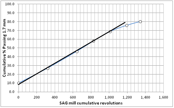 The calculated cumulative mill revolutions to 80% passing 1.7 mm is used together with the mass of the SAG mill charge to compute the SAG mill specific pinion energy, as seen below. The process to determine the revolutions is done in cycles, with the -1.7 mm material (fines) removed from the mill after each cycle up to 60% passing 1.7 mm. After the first grinding target is reached (i.e 60% -1.7 mm), both the fine and coarse materials are returned to the mill for the remainder of the SAG mill grinding cycles to reach the 80% -1.7 mm test end point. A typical SAGDesign SAG test grind curve is illustrated below.